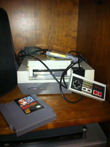 So about a year and a half ago I’m cleaning out a dusty Rubbermaid tub in my basement and there it is…the Holy Grail of video-gaming systems: the original Nintendo. My friends in college threw me a 20 1/2 birthday party my Sophomore year (mainly under duress because I pissed and moaned so much about having a summer birthday and no one being around to celebrate it with me), and one of those friends gave me his Nintendo. Again, pretty much under duress because I had essentially taken the thing over and become increasingly annoyed when HE played – saying out loud with a hiss when it was his turn “Oh just DIE already”.